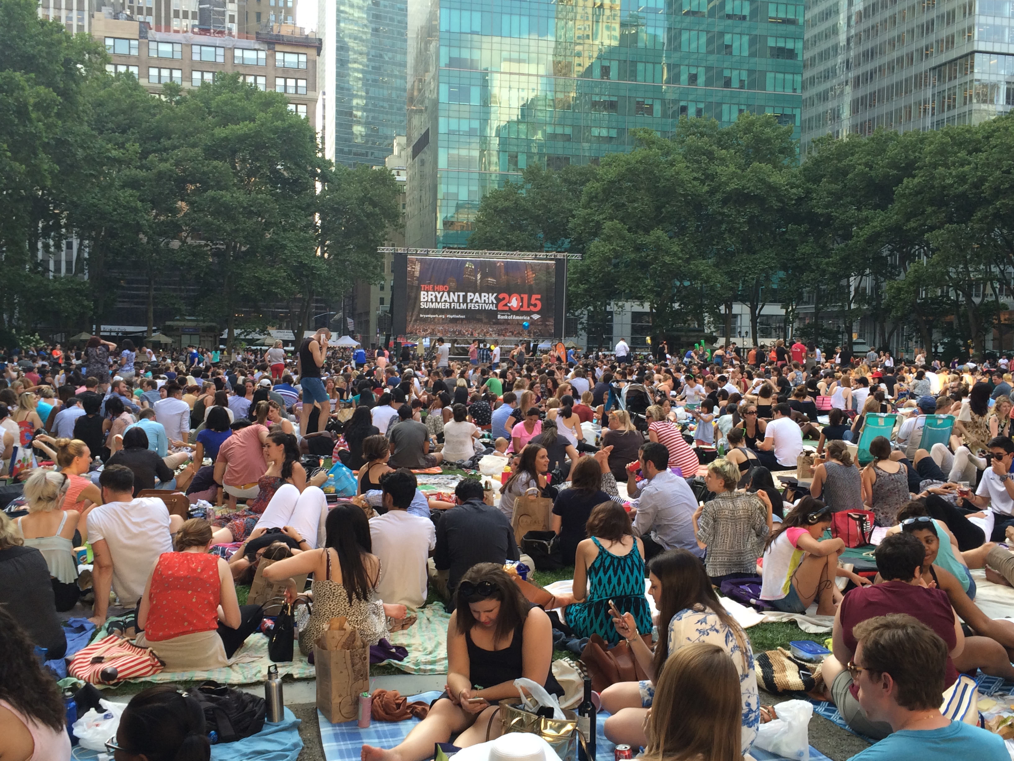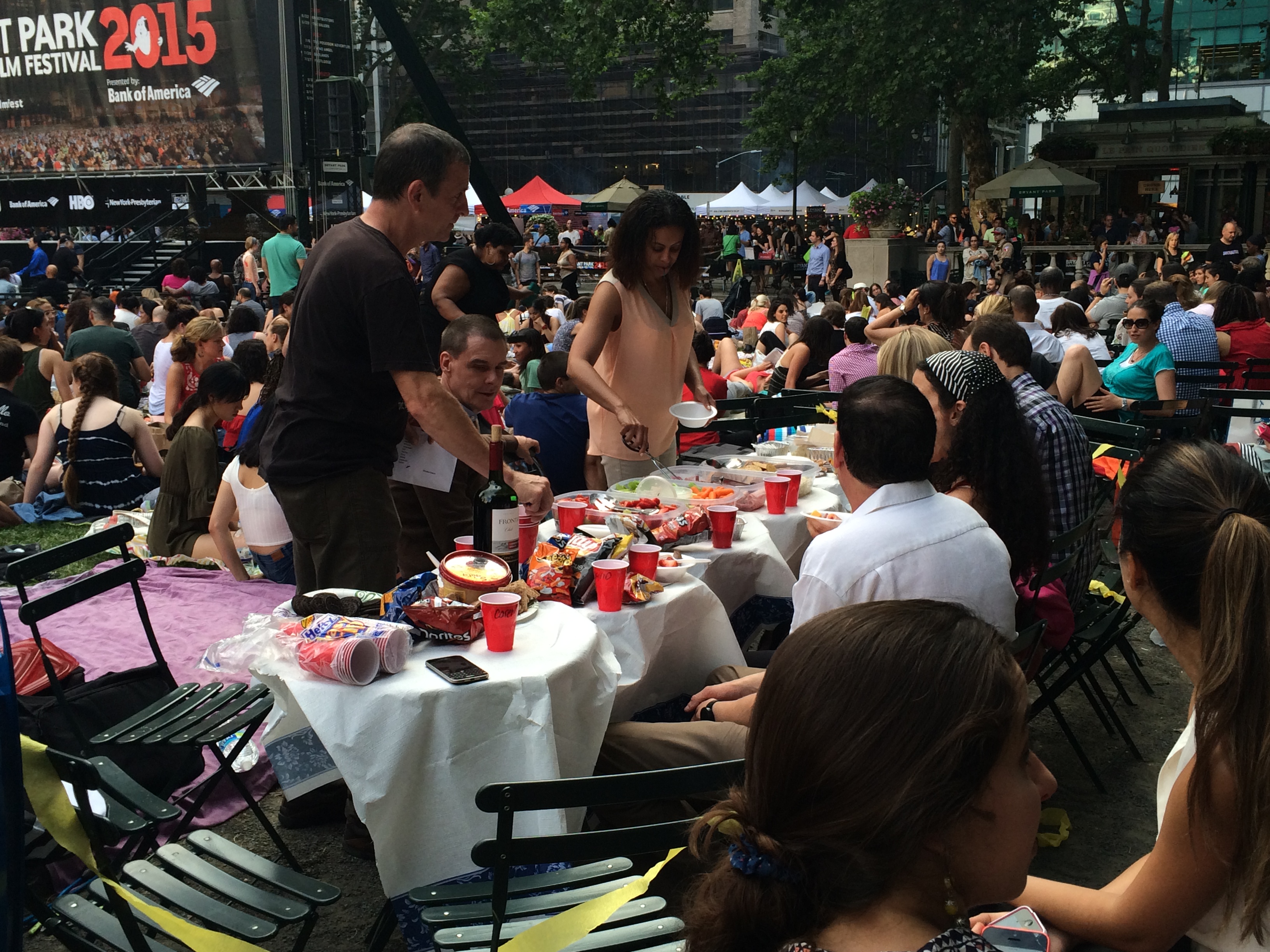 It seemed like everyone and their brother showed up last night for the inaugural screening of The HBO Bryant Park Summer Film Festival 2015 presented by Bank of America. The park was filled to the gills. The lawn opened at 5pm, and within 5 minutes there are few green spots remaining. There’s a bit of cult-like atmosphere at this free film series that you don’t get at other outdoor screening series in the city. People really get into it and they they bring elaborate feasts. This series also differs from some of the others in that it features a diverse mix of Hollywood classics.