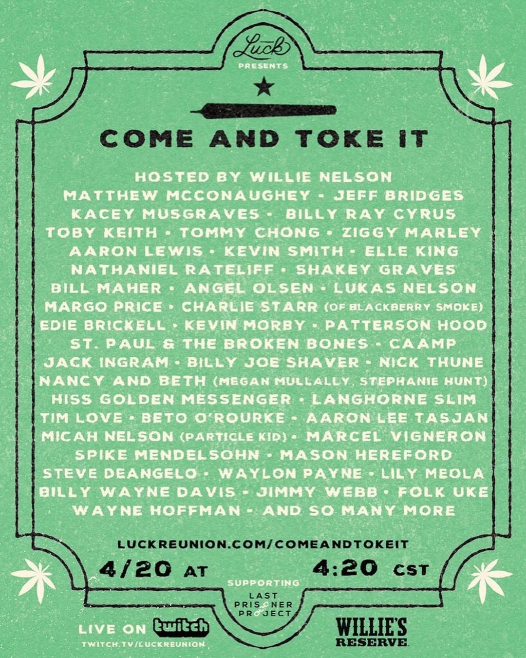 Besides the 420 entertainment, Luck and Willie’s Reserve (Nelson’s cannabis company) have teamed up for the #cometokeit #passleft challenge. Fans are welcome to post videos of themselves on social media, passing the toke material of their choice to the left with the hashtags #ComeandTokeIt #PassLeft. According to the Luck website: Select videos will be featured during the Come and Toke It broadcast before Willie takes the last hit on air. To be considered, get those videos in pronto.